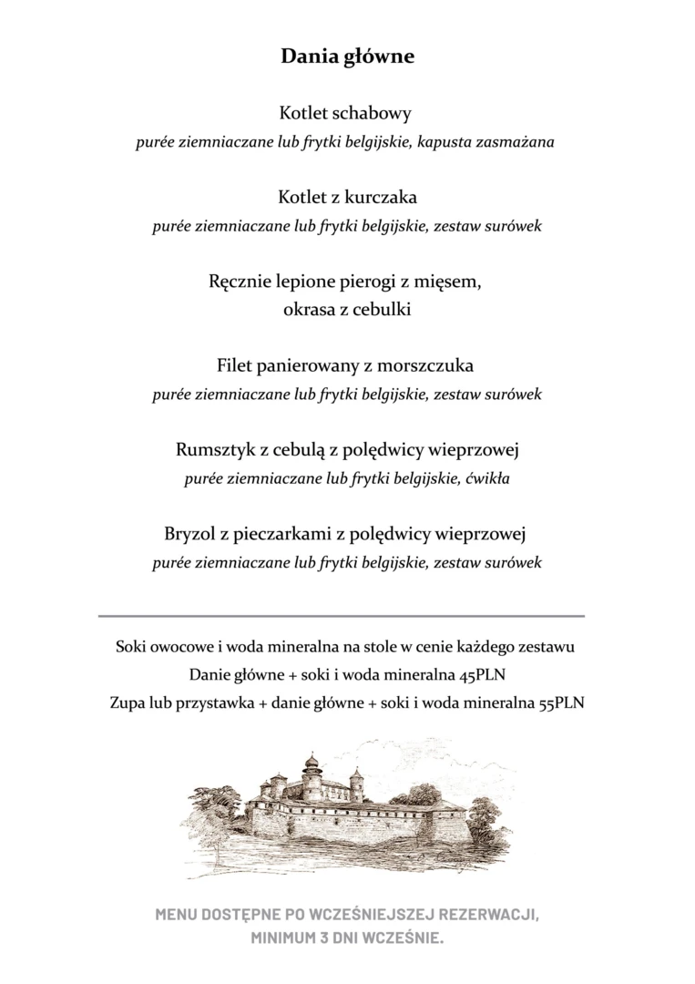 Rezerwacje wykraczające poza godziny otwarcia restauracji wymagają uzgodnienia min. 2 dni wcześniej. Rezerwacja tel: 784-355-416.