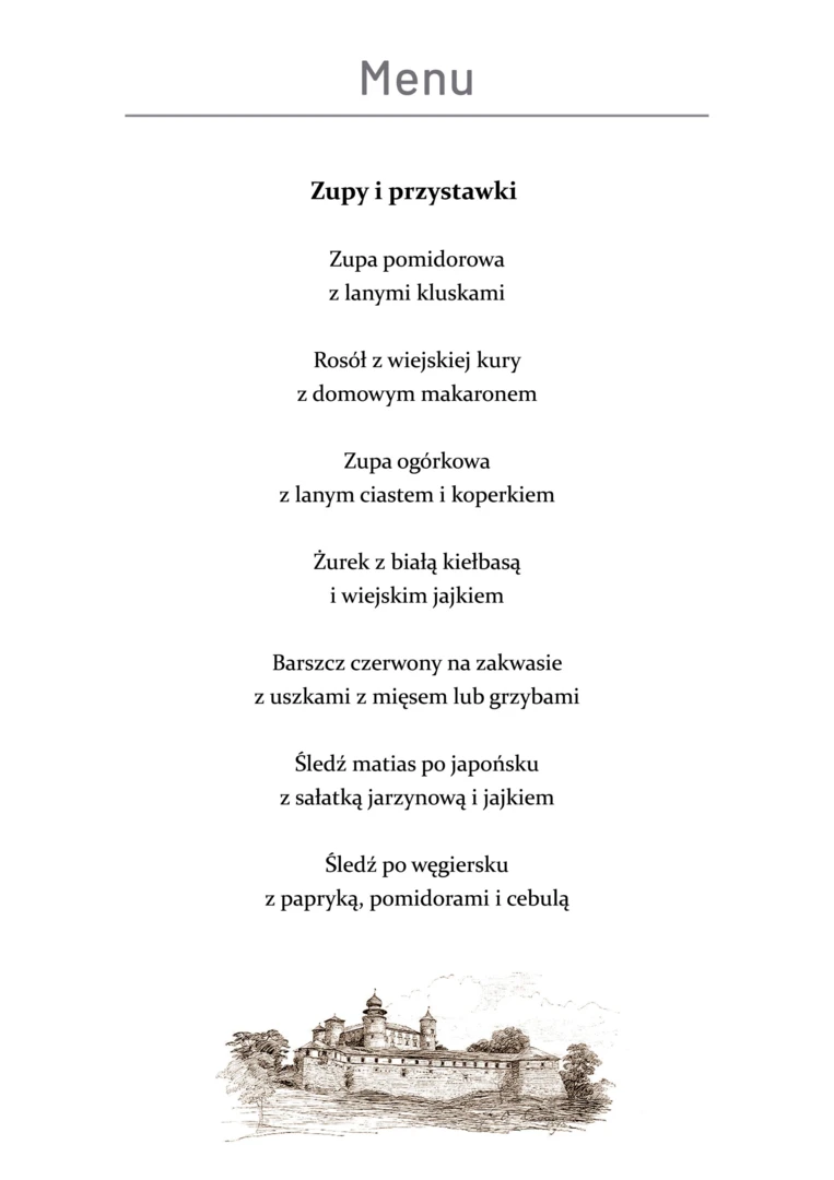 Obecny dzisiaj na zamku Mistrz kuchni, Marcin Pławecki zaprasza na: rosół polski z kapłona lub gęsiny, kurczęta w sosie z leśnych grzybów, kalmary, polskie ślimaki zapiekane w maśle, węgierskie gołąbki z liści kiszonej kapusty i wędzoną papryką, burgera z jelenia czy staropolski bigosek z koguta. A do tego osobiście wraz z kucharzami przygotowuje pyszne lody truskawkowe lub jagodowe. W naszej ofercie dostępne są również świeżo tłoczone soki owocowe i warzywne, lokalny cydr, wina z małopolskich winnic i zamkowe piwo z browaru Figatella!